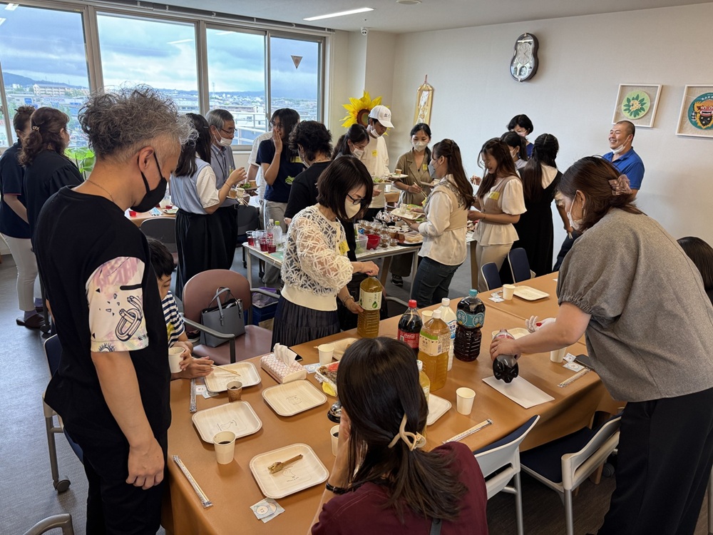 組合に加入しておられる事業所の外国人スタッフの交流会を開催いたしました。皆で一品持ち寄りの食事を楽しんだり、出身地の紹介などを含んだ自己紹介などを行い交流を深めました。初めて会うスタッフ同士も、すぐに仲良くなり楽しい時間を過ごすことが出来ました。